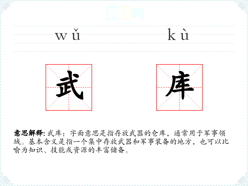 武库:字面意思是指存放武器的仓库,通常用于军事领域。基本含义是指一个集中存放武器和军事装备的地方,也可以比喻为知识、技能或资源的丰富储备。