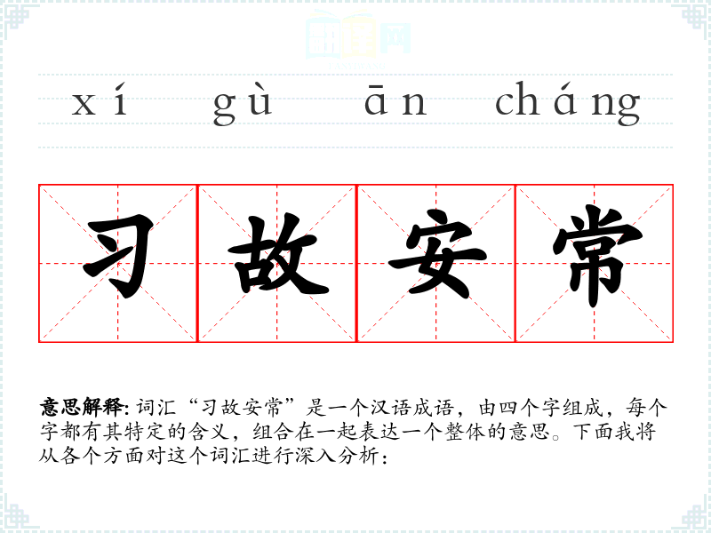 词汇“*故安常”是一个汉语成语,由四个字组成,每个字都有其特定的含义,组合在一起表达一个整体的意思。下面我将从各个方面对这个词汇进行深入分析: