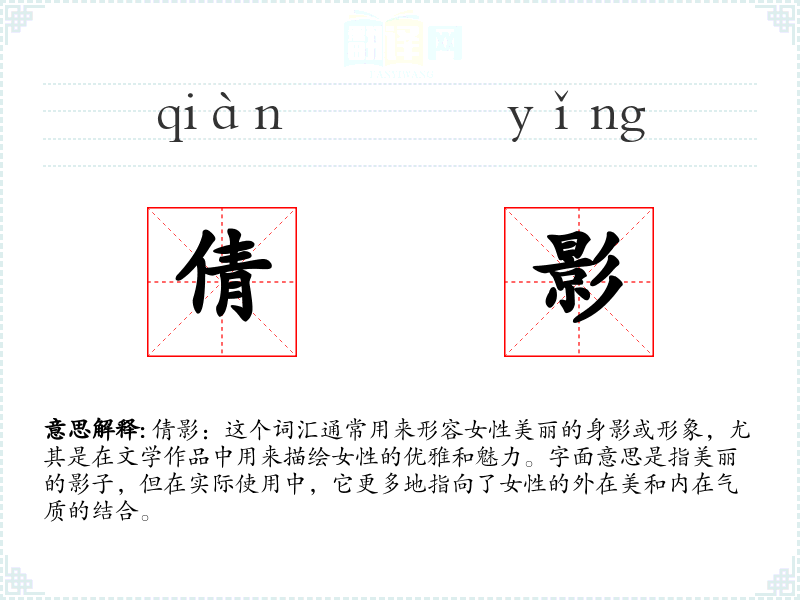 倩影:这个词汇通常用来形容女性美丽的身影或形象,尤其是在文学作品中用来描绘女性的优雅和魅力。字面意思是指美丽的影子,但在实际使用中,它更多地指向了女性的外在美和内在气质的结合。