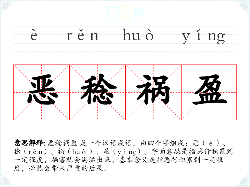 恶稔祸盈 是一个汉语成语,由四个字组成:恶(è)、稔(rěn)、祸(huò)、盈(yíng)。字面意思是指恶行积累到一定程度,祸害就会满溢出来。基本含义是指恶行积累到一定程度,必然会带来严重的后果。