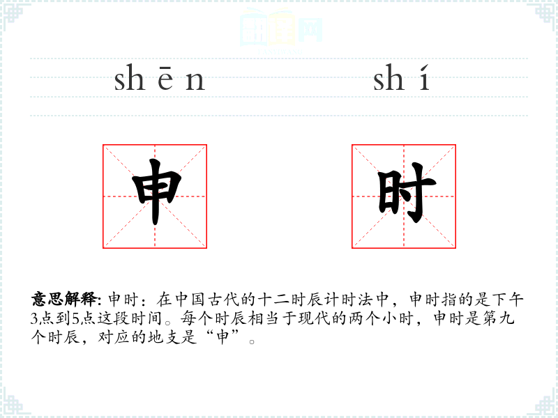 对应词汇:在西方文化中,没有直接对应申时的词汇,但可以类比为“afternoon”(下午)的一部分。