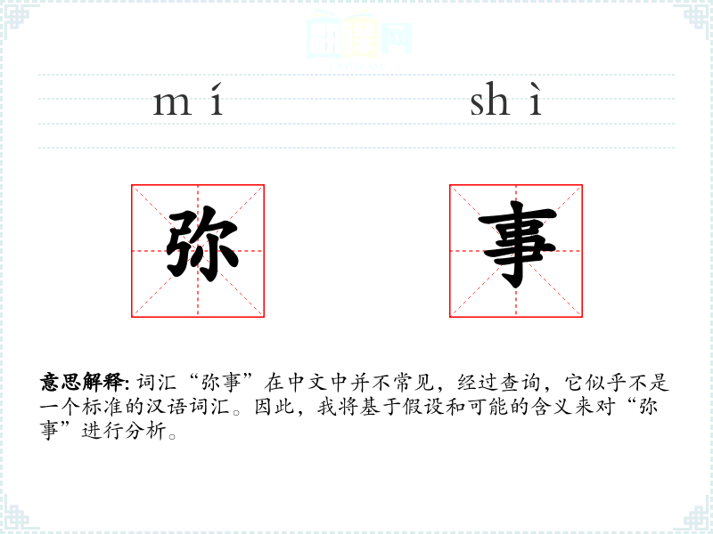 尽管“弥事”不是一个常见词汇,通过假设和可能的含义,我们可以对其进行一定程度的分析和理解。在语言学*和表达中,了解和掌握词汇的多样性和灵活性是非常重要的。