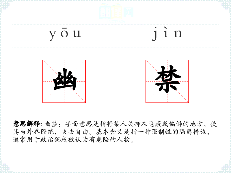 幽禁:字面意思是指将某人关押在隐蔽或偏僻的地方,使其与外界隔绝,失去自由。基本含义是指一种强制性的隔离措施,通常用于政治犯或被认为有危险的人物。