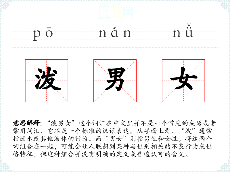 由于“泼男女”不是一个标准词汇,它的词源和演变无从考究。在汉语中,类似的表达可能是后来人们在特定语境中创造出来的,但并没有形成广泛的语言习惯。
