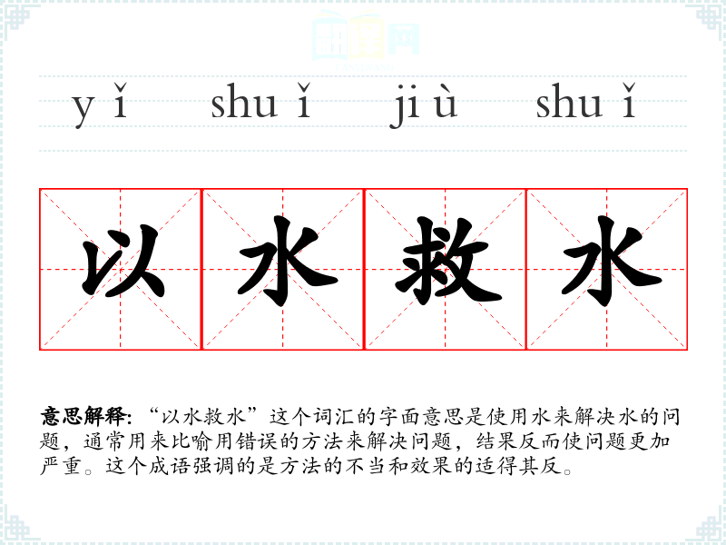 “以水救水”这个词汇的字面意思是使用水来解决水的问题,通常用来比喻用错误的方法来解决问题,结果反而使问题更加严重。这个成语强调的是方法的不当和效果的适得其反。