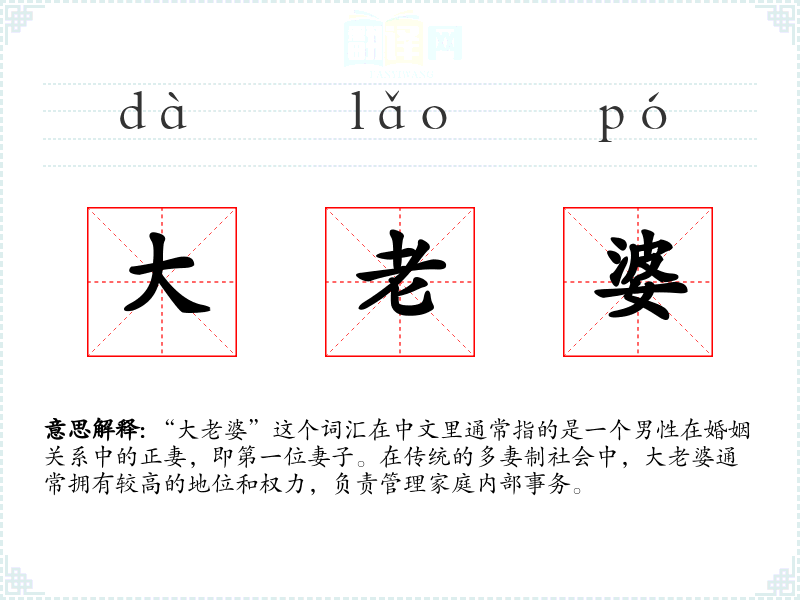 “大老婆”这个词汇在中文里通常指的是一个男性在婚姻关系中的正妻,即第一位妻子。在传统的多妻制社会中,大老婆通常拥有较高的地位和权力,负责管理家庭内部事务。