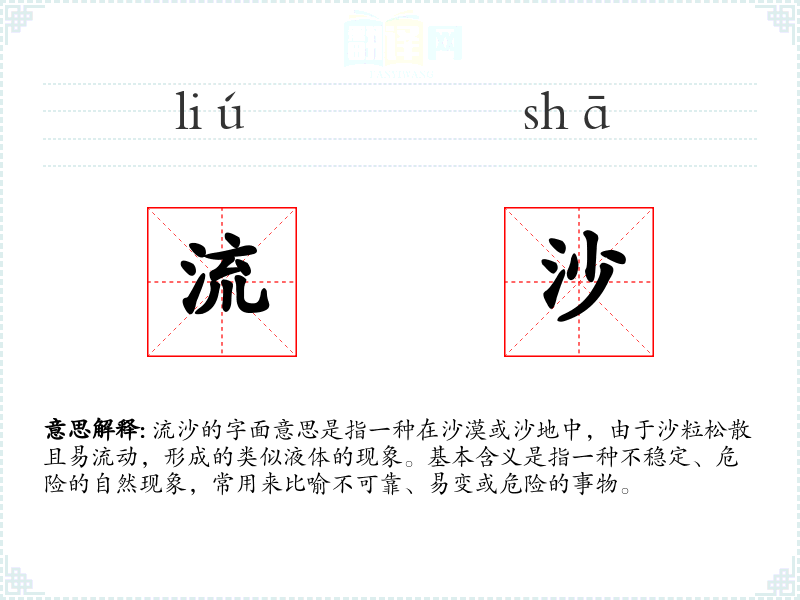 流沙的字面意思是指一种在沙漠或沙地中,由于沙粒松散且易流动,形成的类似液体的现象。基本含义是指一种不稳定、危险的自然现象,常用来比喻不可靠、易变或危险的事物。