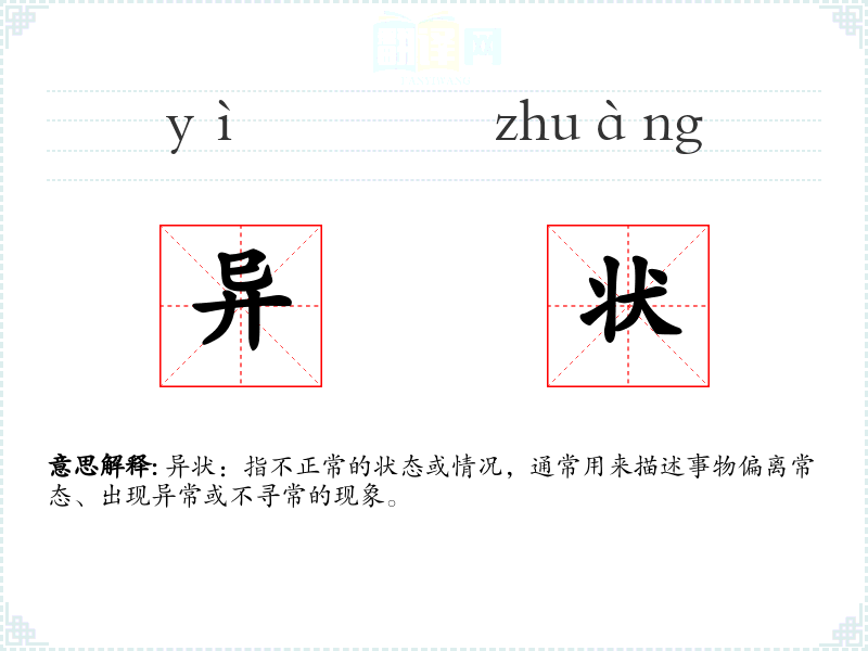 异状一词由“异”和“状”组成。“异”表示不同或异常,“状”表示状态或情况。在古代汉语中,“异状”常用于描述奇异或不寻常的现象。随着语言的发展,其含义逐渐固定为“不正常的状态”。