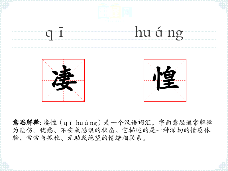 凄惶(qī huáng)是一个汉语词汇,字面意思通常解释为悲伤、忧愁、不安或恐惧的状态。它描述的是一种深切的情感体验,常常与孤独、无助或绝望的情绪相联系。