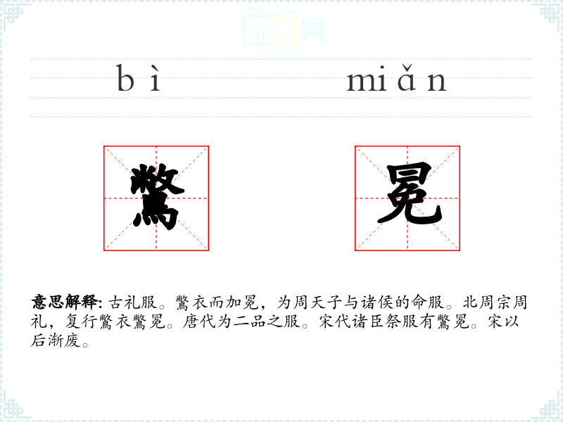 古礼服。鷩衣而加冕,为周天子与诸侯的命服。北周宗周礼,复行鷩衣鷩冕。唐代为二品之服。宋代诸臣祭服有鷩冕。宋以后渐废。
