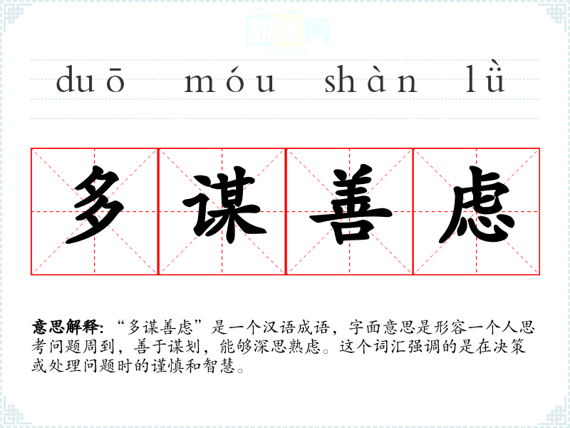 “多谋善虑”是一个汉语成语,字面意思是形容一个人思考问题周到,善于谋划,能够深思熟虑。这个词汇强调的是在决策或处理问题时的谨慎和智慧。