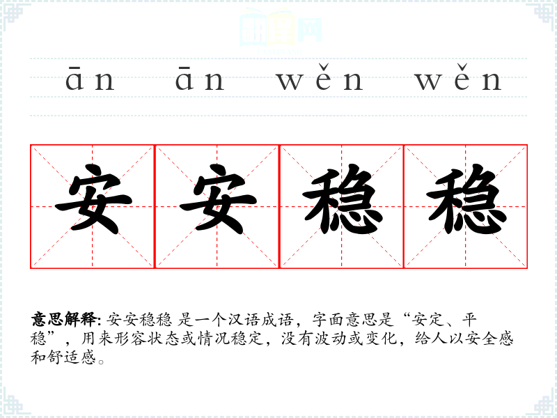 安安稳稳 这个词汇源自汉语,其构成的两个字“安”和“稳”都有稳定、安全的含义。在古代文献中,这两个字常单独使用,后来逐渐组合成一个词组,用来强调稳定和安全的状态。