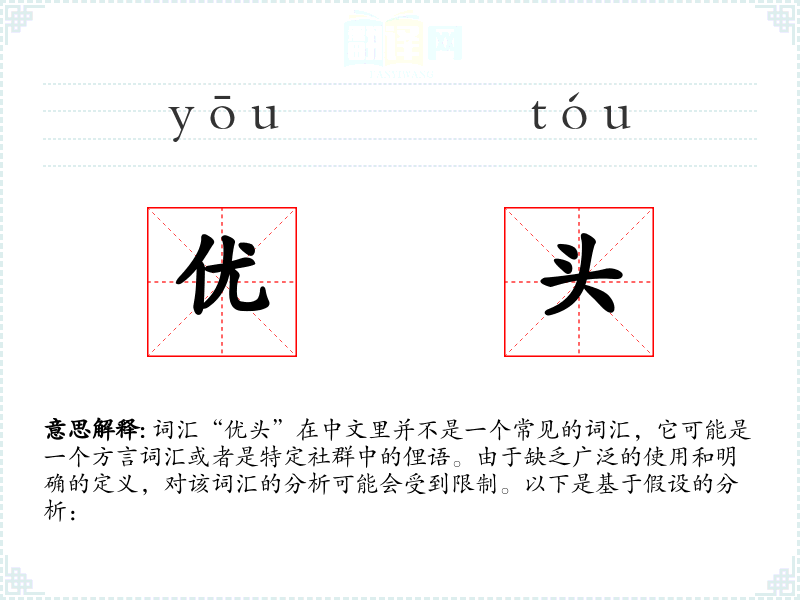 词汇“优头”在中文里并不是一个常见的词汇,它可能是一个方言词汇或者是特定社群中的俚语。由于缺乏广泛的使用和明确的定义,对该词汇的分析可能会受到限制。以下是基于假设的分析: