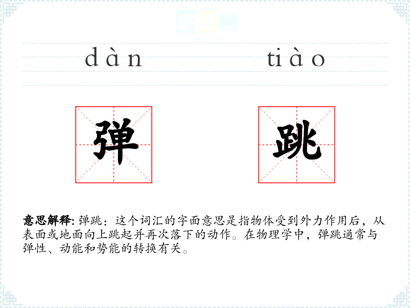 弹跳:这个词汇的字面意思是指物体受到外力作用后,从表面或地面向上跳起并再次落下的动作。在物理学中,弹跳通常与弹性、动能和势能的转换有关。