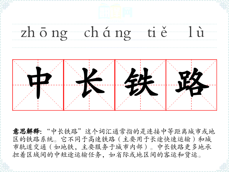 “中长铁路”这个词汇是现代汉语中的一个合成词,由“中”和“长”两个形容词与“铁路”这个名词组合而成。随着**铁路网络的发展和完善,这个词汇逐渐被广泛使用,用以描述特定类型的铁路服务。