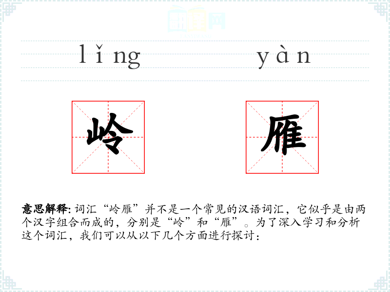 词汇“岭雁”并不是一个常见的汉语词汇,它似乎是由两个汉字组合而成的,分别是“岭”和“雁”。为了深入学*和分析这个词汇,我们可以从以下几个方面进行探讨: