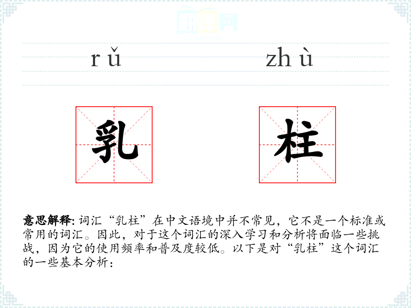 词汇“乳柱”在中文语境中并不常见,它不是一个标准或常用的词汇。因此,对于这个词汇的深入学习和分析将面临一些挑战,因为它的使用频率和普及度较低。以下是对“乳柱”这个词汇的一些基本分析: