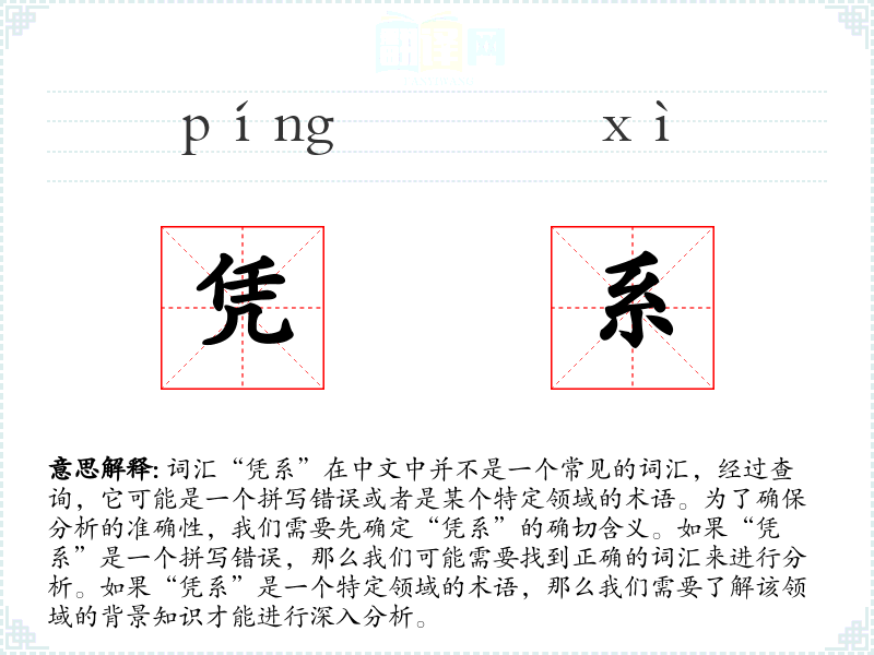 由于“凭系”不是一个常见的词汇,我们无法提供一个确切的定义和分析。如果“凭系”是一个特定领域的术语,那么了解该领域的背景知识将有助于深入分析。在语言学习和表达中,了解特定领域的术语是非常重要的,但“凭系”作为一个不常见的词汇,可能不会在日常语言学习中起到重要作用。