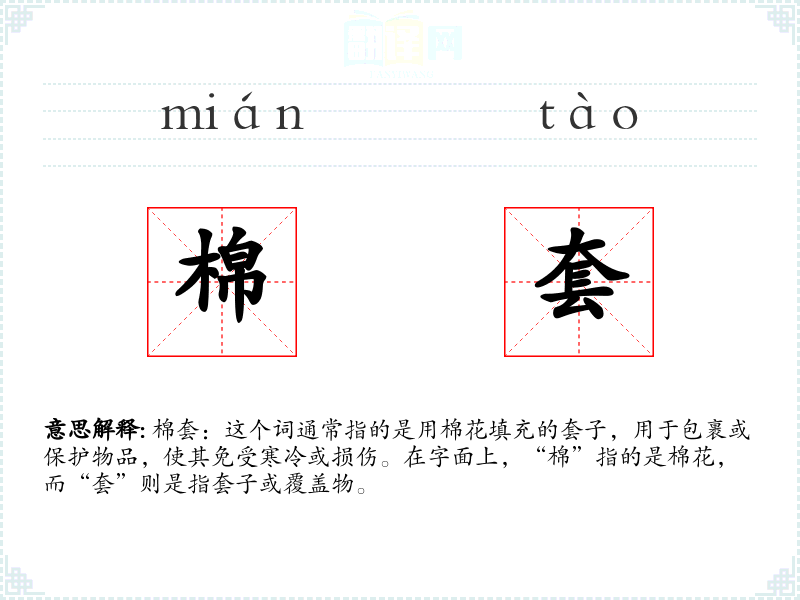 棉套:这个词通常指的是用棉花填充的套子,用于包裹或保护物品,使其免受寒冷或损伤。在字面上,“棉”指的是棉花,而“套”则是指套子或覆盖物。