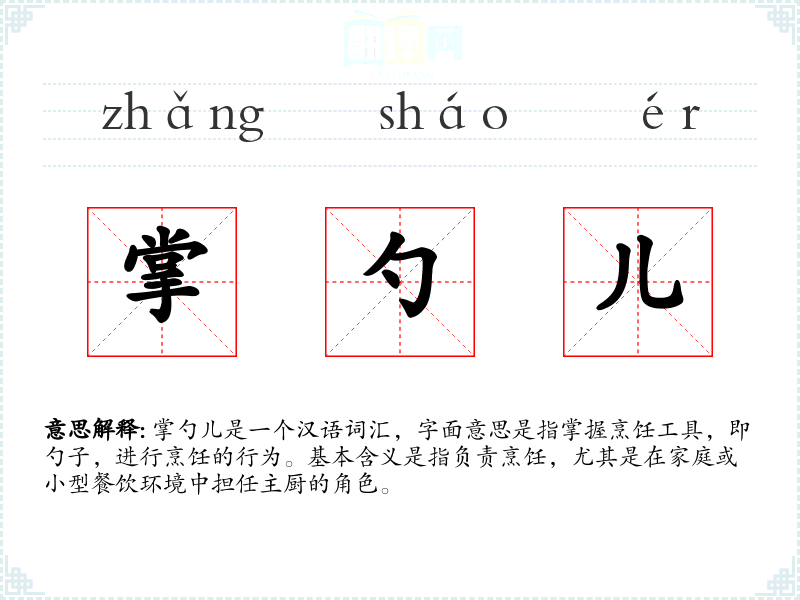 掌勺儿是一个汉语词汇,字面意思是指掌握烹饪工具,即勺子,进行烹饪的行为。基本含义是指负责烹饪,尤其是在家庭或小型餐饮环境中担任主厨的角色。