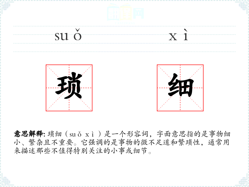 琐细(suǒ xì)是一个形容词,字面意思指的是事物细小、繁杂且不重要。它强调的是事物的微不足道和繁琐性,通常用来描述那些不值得特别关注的小事或细节。