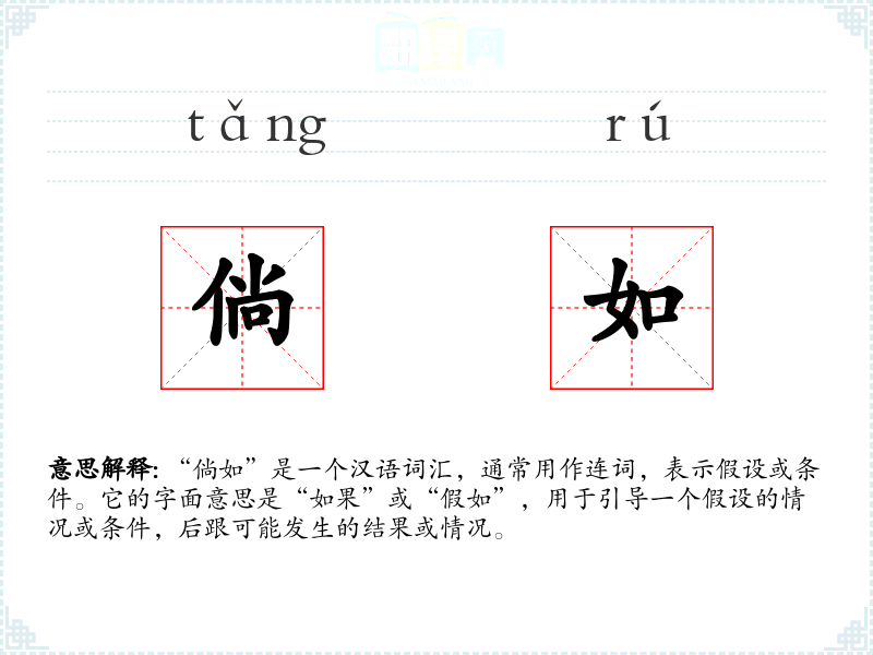 “倘如”是一个汉语词汇,通常用作连词,表示假设或条件。它的字面意思是“如果”或“假如”,用于引导一个假设的情况或条件,后跟可能发生的结果或情况。