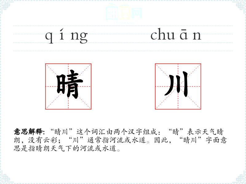 “晴川”这个词汇由两个汉字组成:“晴”表示天气晴朗,没有云彩;“川”通常指河流或水道。因此,“晴川”字面意思是指晴朗天气下的河流或水道。