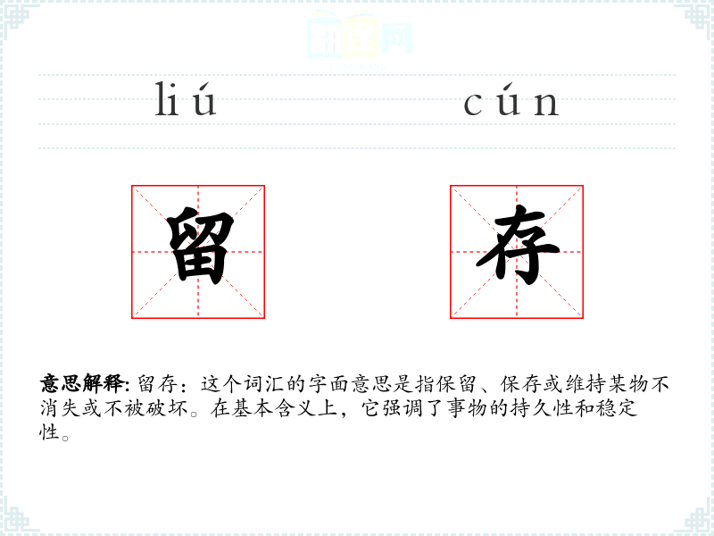 留存:这个词汇的字面意思是指保留、保存或维持某物不消失或不被破坏。在基本含义上,它强调了事物的持久性和稳定性。
