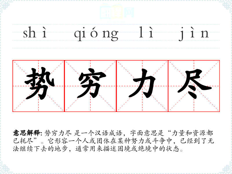 势穷力尽 是一个汉语成语,字面意思是“力量和资源都已耗尽”。它形容一个人或团体在某种努力或斗争中,已经到了无法继续下去的地步,通常用来描述困境或绝境中的状态。