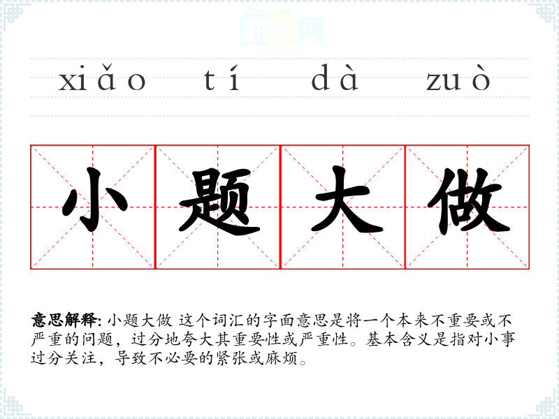 小题大做 这个词汇的字面意思是将一个本来不重要或不严重的问题,过分地夸大其重要性或严重性。基本含义是指对小事过分关注,导致不必要的紧张或麻烦。