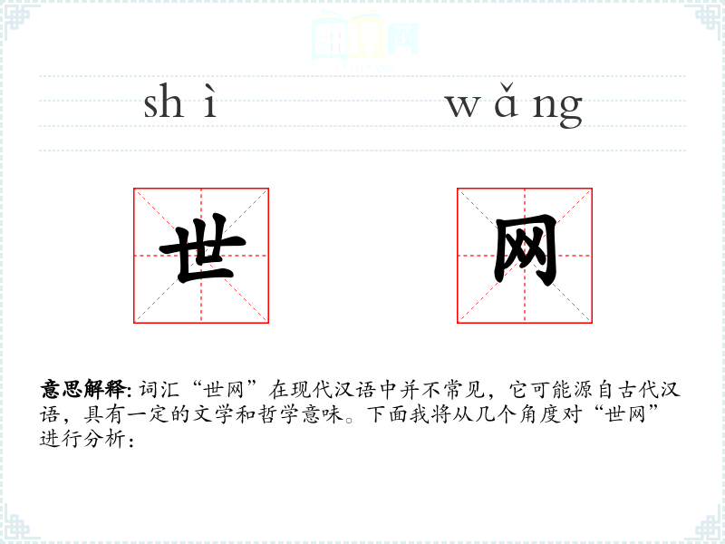 词汇“世网”在现代汉语中并不常见,它可能源自古代汉语,具有一定的文学和哲学意味。下面我将从几个角度对“世网”进行分析: