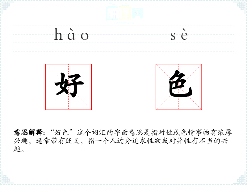 “好色”这个词汇的字面意思是指对性或色情事物有浓厚兴趣,通常带有贬义,指一个人过分追求性欲或对异性有不当的兴趣。