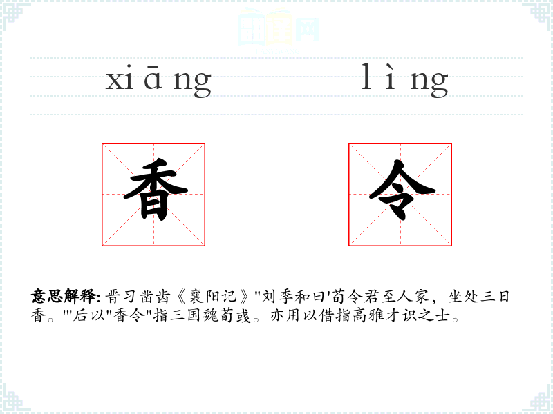 晋习凿齿《襄阳记》"刘季和曰'荀令君至人家,坐处三日香。'"后以"香令"指三国魏荀彧。亦用以借指高雅才识之士。
