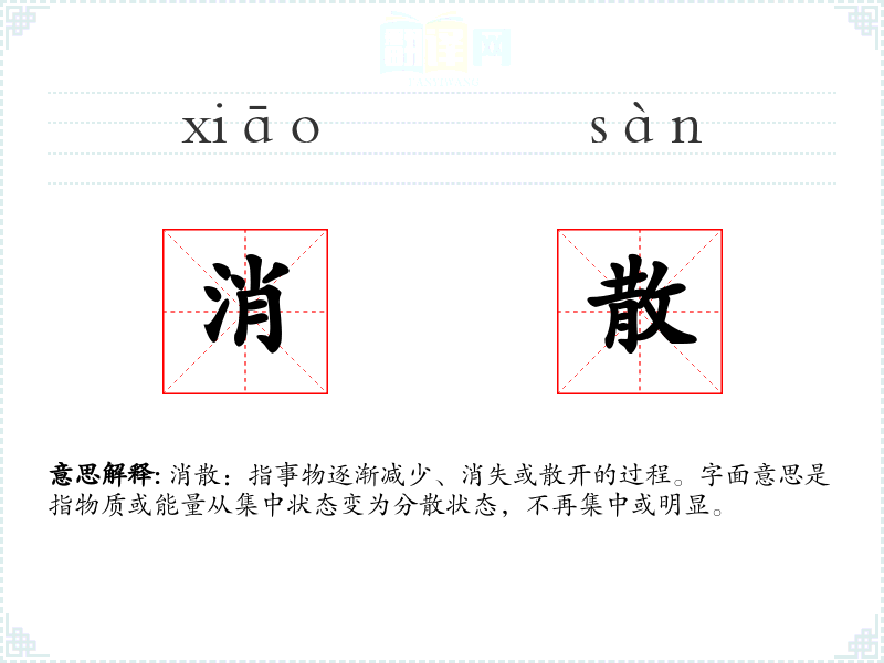 消散:指事物逐渐减少、消失或散开的过程。字面意思是指物质或能量从集中状态变为分散状态,不再集中或明显。