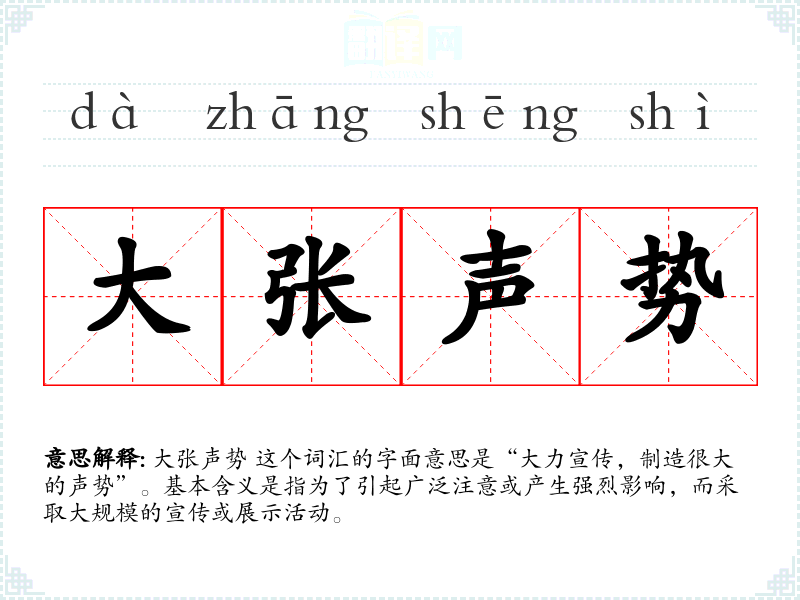 大张声势 这个词汇的字面意思是“大力宣传,制造很大的声势”。基本含义是指为了引起广泛注意或产生强烈影响,而采取***的宣传或展示活动。