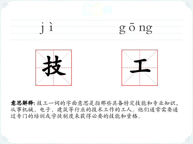 - 反义词:管理者、设计师。这些词汇代表了技工的上层或设计层面,与技工的实际操作和执行形成对比。