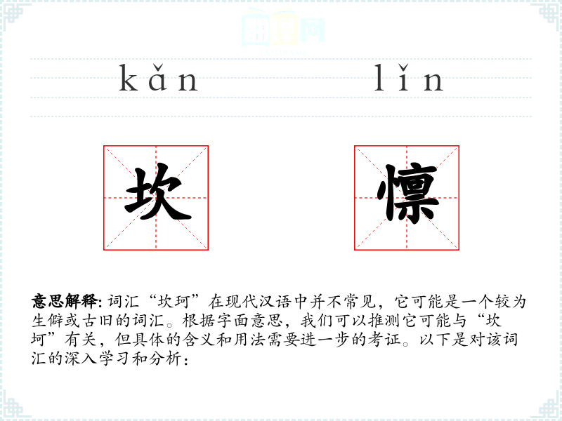 词汇“坎珂”在现代汉语中并不常见,它可能是一个较为生僻或古旧的词汇。根据字面意思,我们可以推测它可能与“坎坷”有关,但具体的含义和用法需要进一步的考证。以下是对该词汇的深入学*和分析: