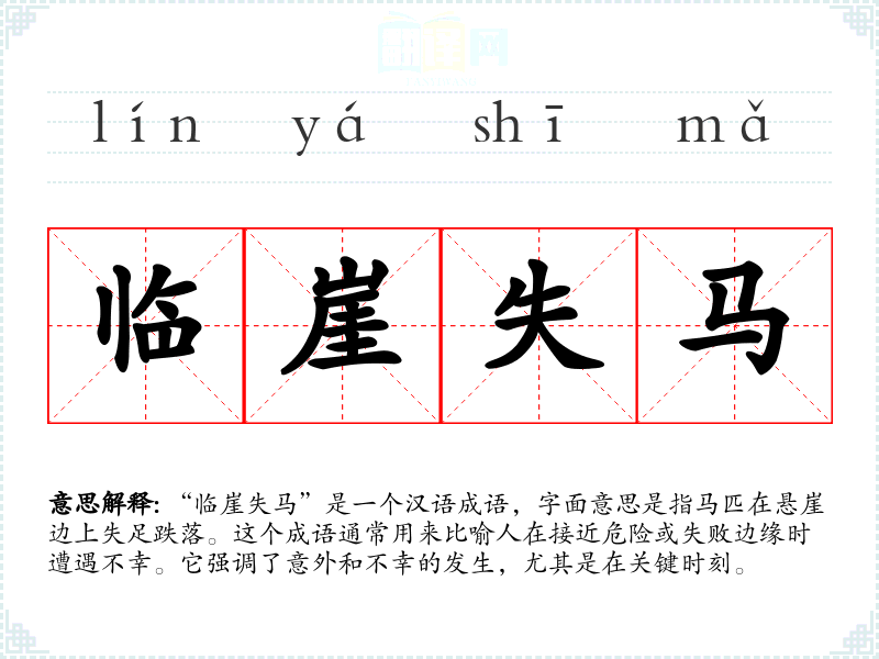 - 功败垂成:指事情在即将成功时失败,与“临崖失马”有相似的含义。