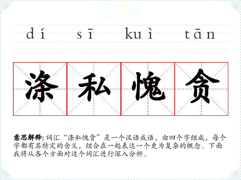 词汇“涤私愧贪”是一个汉语成语,由四个字组成,每个字都有其特定的含义,组合在一起表达一个更为复杂的概念。下面我将从各个方面对这个词汇进行深入分析。