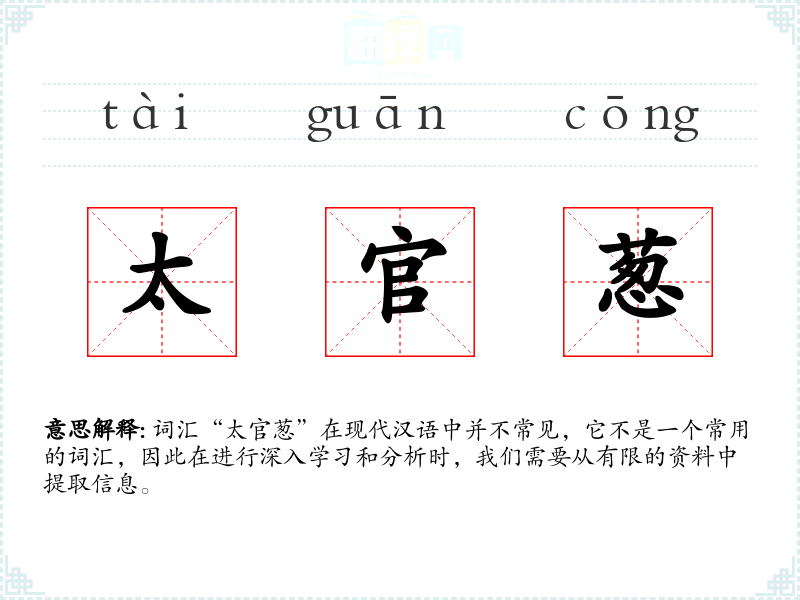 由于“太官葱”不是一个常用词汇,它在现代文学、口语或专业领域中很少出现。在古代文献中,如果提到“太官葱”,可能是指宫廷膳食中的一种特殊食材。