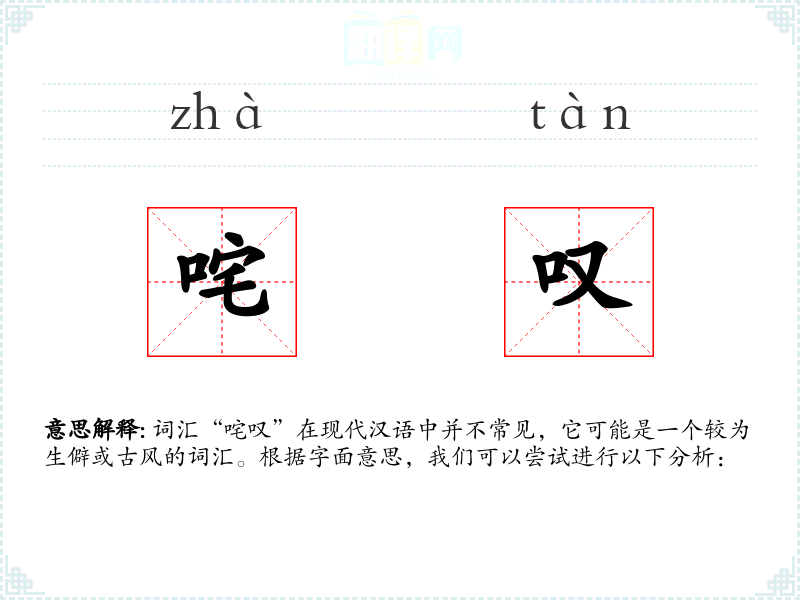 词汇“咤叹”在现代汉语中并不常见,它可能是一个较为生僻或古风的词汇。根据字面意思,我们可以尝试进行以下分析: