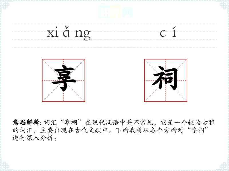 “享祠”作为一个古雅的词汇,虽然在现代汉语中不常见,但它承载了丰富的历史文化信息。了解和学*这样的词汇,有助于我们更好地理解*传统文化和历史。在语言学和表达中,适当地使用这样的词汇,可以增添语言的深度和韵味。