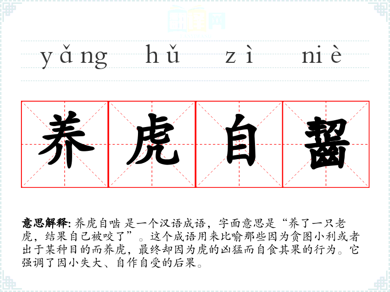 养虎自啮 是一个汉语成语,字面意思是“养了一只**,结果自己被咬了”。这个成语用来比喻那些因为贪图小利或者出于某种目的而养虎,最终却因为虎的凶猛而自食其果的行为。它强调了因小失大、自作自受的后果。