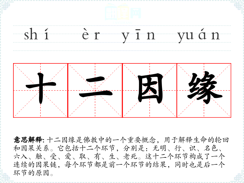 十二因缘是**中的一个重要概念,用于解释生命的轮回和因果关系。它包括十二个环节,分别是:无明、行、识、名色、六入、触、受、爱、取、有、生、老死。这十二个环节构成了一个连续的因果链,每个环节都是前一个环节的结果,同时也是后一个环节的原因。