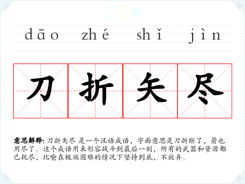 刀折矢尽 是一个汉语成语,字面意思是刀折断了,箭也用尽了。这个成语用来形容战斗到最后一刻,所有的武器和资源都已耗尽,比喻在极端困难的情况下坚持到底,不放弃。