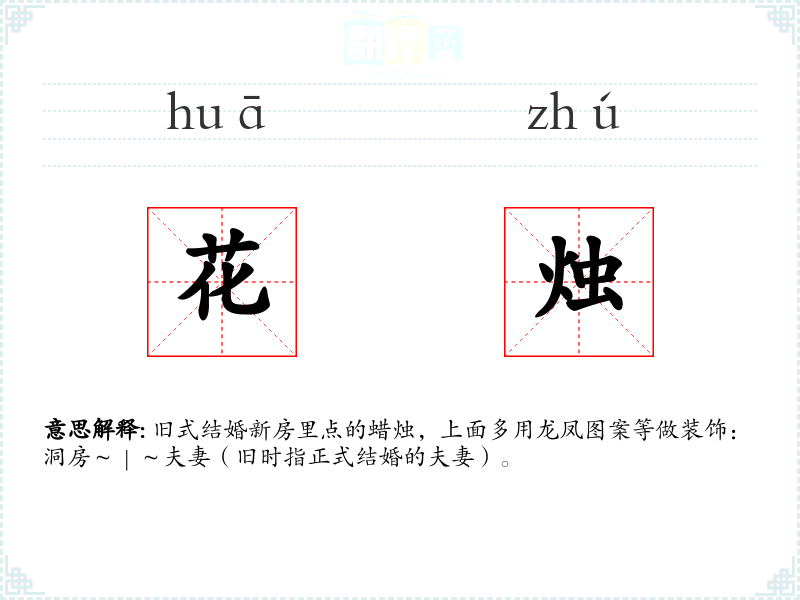 旧式结婚新房里点的蜡烛,上面多用龙凤图案等做装饰:洞房~|~夫妻(旧时指正式结婚的夫妻)。