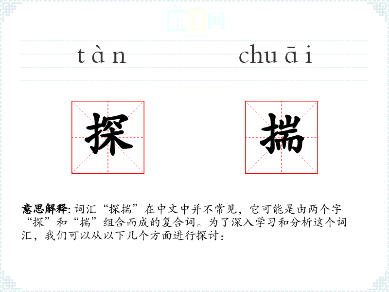 词汇“探揣”在中文中并不常见,它可能是由两个字“探”和“揣”组合而成的复合词。为了深入学*和分析这个词汇,我们可以从以下几个方面进行探讨: