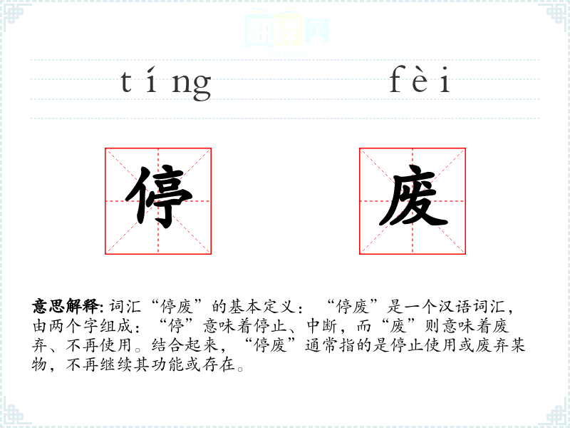 词汇“停废”的基本定义: “停废”是一个汉语词汇,由两个字组成:“停”意味着停止、中断,而“废”则意味着废弃、不再使用。结合起来,“停废”通常指的是停止使用或废弃某物,不再继续其功能或存在。