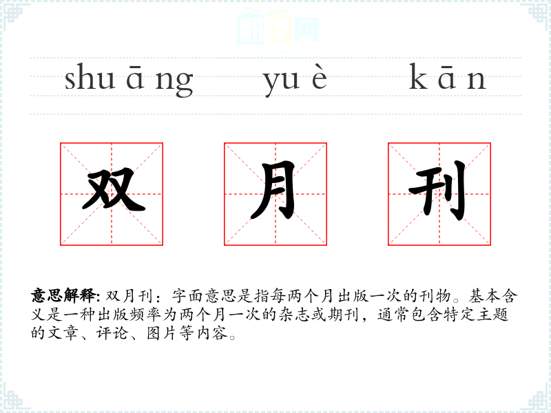 双月刊:字面意思是指每两个月出版一次的刊物。基本含义是一种出版频率为两个月一次的杂志或期刊,通常包含特定主题的文章、评论、图片等内容。
