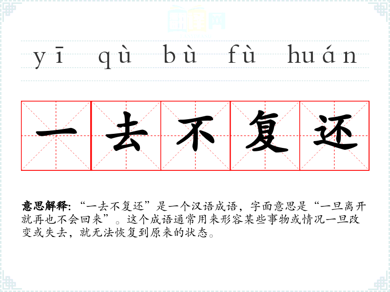 “一去不复还”是一个汉语成语,字面意思是“一旦离开就再也不会回来”。这个成语通常用来形容某些事物或情况一旦改变或失去,就无法恢复到原来的状态。